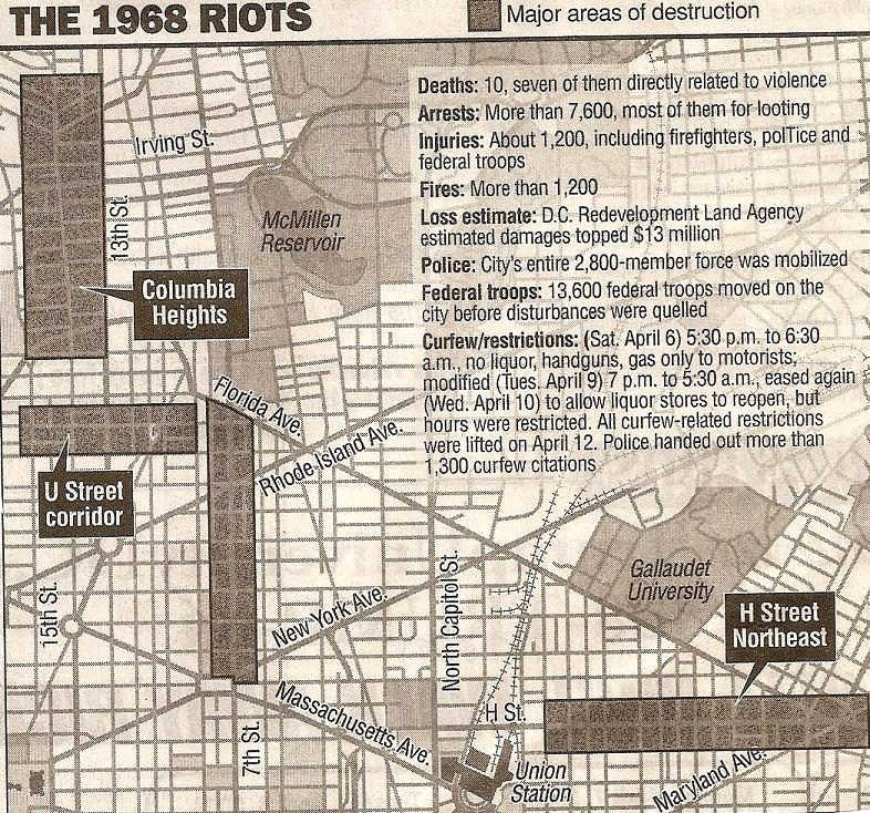 In the aftermath of the 1968 Riots, the movement of middle class Washingtonians to the suburbs of the city only increased, spurred in part by simmering racial tensions in the neighborhoods hardest hit by the disorder and violence. The greater Shaw neighborhood was particularly impacted because of its position as an historic border between black and white Washington. Whole blocks of the neighborhood lay in ruins for years, until the arrival of the Metro in 1991 decreased the neighborhood’s isolation and increased incentive for development in the area.